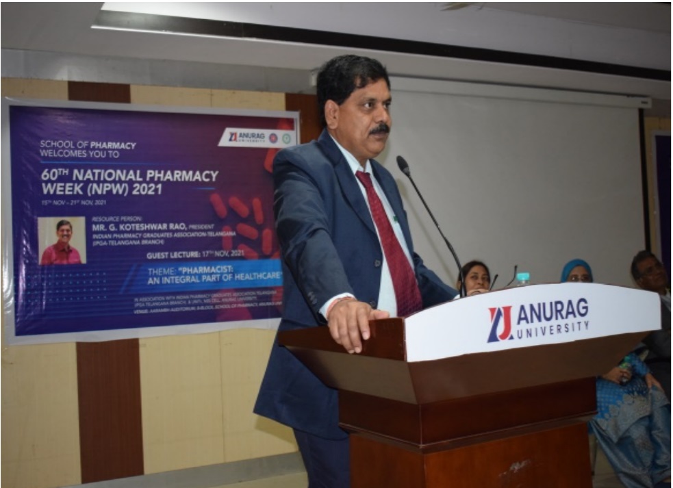 The School of Pharmacy, Anurag University, Hyderabad, Telangana State Celebrated remarkably the “60 th National Pharmacy Week (NPW) -2021” (15 th -21 st Nov 2021). The National Pharmacy Week was collaborated with the Indian Pharmacy Graduates Association-(IPGA), Telangana Branch. &Unit-I, National Service Scheme (NSS) of Anurag University. The theme of the National Pharmacy Week “NPW-2021 is “Pharmacist- An Integral Part of Health Care”. TheNPW-2021, was a platform to create awareness amongst the public, other healthcare providers and the authorities, about the NPW theme in particular and about the pharmacy profession and the role of the pharmacist in general. The invited resource person was, Mr. G. Koteshwar Rao, President-Indian Pharmacy Graduates Association-(IPGA), Telangana Branch. The NPW-2021, was directed by Dr. VasudhaBakshi, Dean, School of Pharmacy Anurag University. The National Pharmacy Week “NPW-2021” was witnessed by the gracious presence of Prof. S. Ramachandram, Vice-Chancellor, Anurag University, Prof. SyedaSameen Fatima, Registrar, Anurag University and S. Neelima, CEO, Anurag University.