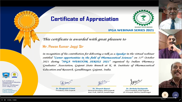 Indian Pharmacy Graduates’ Association, Gujarat State Branch has organized Webinar Series 2021 during which one virtual webinar was organized On 11th October 2021, Monday at KBIPER on Microsoft Teams application. Mr. Pawan Kumar Jaggi Sir was the eminent speaker for the webinar, who had delivered his talk on the topic “Career Opportunities in the field of Pharmaceutical Sciences”. Dr. Bhagirath Patel, President IPGA Gujarat did welcome the eminent speaker, present guest, Members of IPGA and all the participants for the webinar. Dr. Palak Shah, Department of Pharmacology introduced the Speaker. All the participants were informed about the IPGA and its activities, membership benefits and about the webinar. Dr. Shrikalp Deshpande, Principal-KBIPER, Vice President-IPGA Gujarat has given brief about the KBIPER-KSV and courses offered at the Institute. The speech of the speaker guided everyone for enhancing their vision for career opportunities in the field of pharmacy and gave complete information for all the branches of pharmaceutical field like Clinical Research Organizations, Hospital Pharmacy, Clinical Pharmacy, Medical Writing, Industry, Designing and packaging of pharmaceuticals, Academia as well as Government Sector including Regulatory affairs, Drug Inspector, Government Analyst at Central and State govt laboratories, NPPA, NIB, DRDO etc. where one can find the avenues to build pharmaceutical career. At the end he discussed various merits of Pharmaceutical sciences like Diverse career options, job stability, Opportunity to help people in different ways, Respectable remuneration, Respectful stature in the society with highest level of trust in Pharmacists globally by the people after teachers, doctors, nurses, and firefighters. His speech was very motivative and inspirational and unique during the entire webinar. The session was interactive with live question-answer time slot at the end of webinar for one-to-one interaction with the attendees. Dr. Divyesh Shastri given vote of thanks, felicitated Mr. Pawan Kumar Jaggi Sir with e-certificate of the Webinar and acknowledge the thanks to the President and Secretary of IPGA Central branch. More than 200 participants including faculties and students from all over India has attended the webinar actively. The overall coordination during the webinar was handled by the general secretary of IPGA Gujarat branch Dr. Divyesh Shastri along with faculty of KBIPER Dr. Palak Shah Dr. Lata Panchal and student coordinator Ms. Khushi N Panchal.